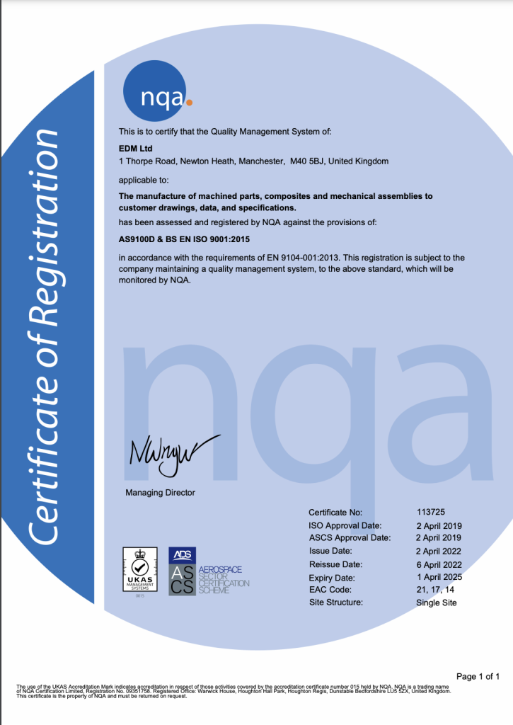 EDM Ltd is delighted to announce a significant milestone in its pursuit of quality and excellence. Following the NQA AS9100 Surveillance visit conducted on January 17th-18th, 2024, EDM has emerged with flying colours, achieving a remarkable result that underscores its commitment to excellence.